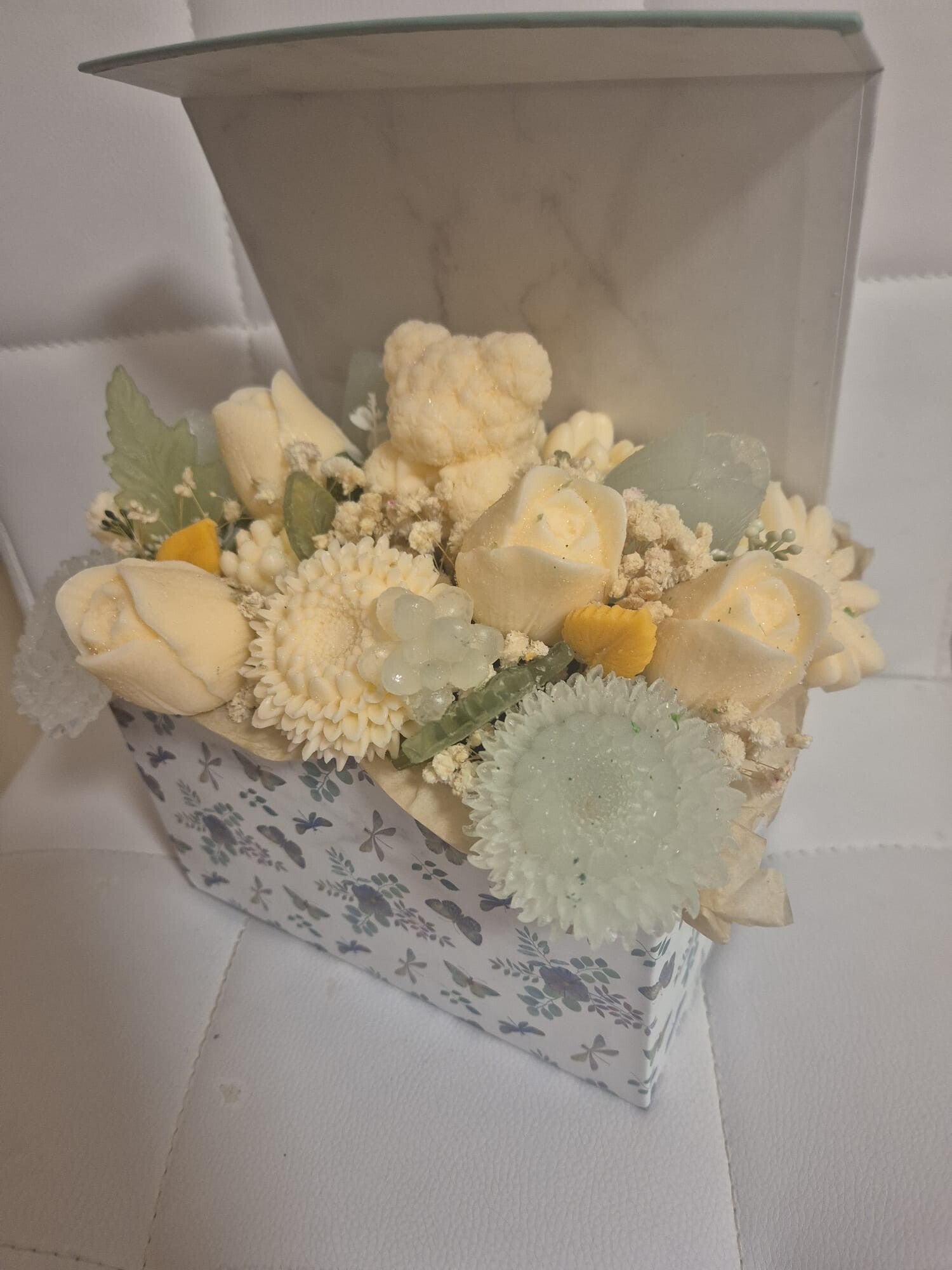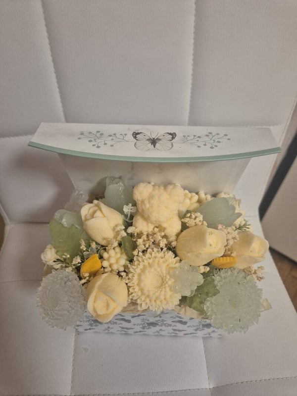 A combination of colorful flowers and leaves made from fragrant soap, with a teddy bear in the center — all in soft pastel spring tones, complemented by tiny dried blossoms.