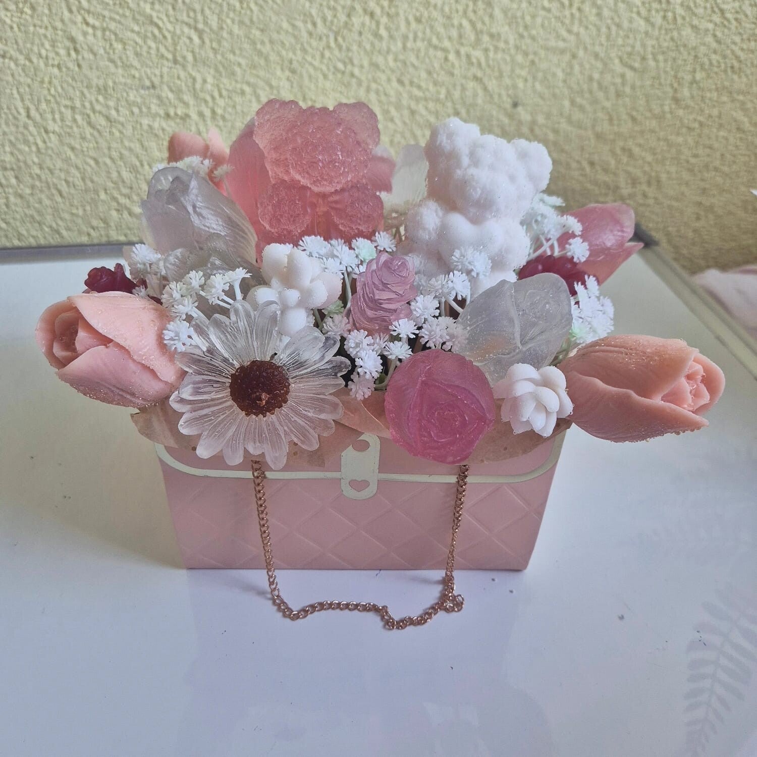 Two adorable soap teddy bears in soft white and pastel pink sit inside a little bag, surrounded by roses and delicate meadow flowers.